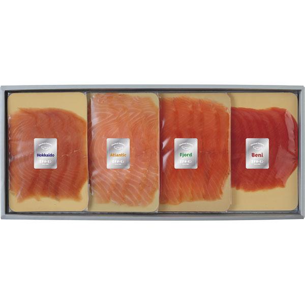 【内容】 フィヨルドサーモンスモークスライス・アトランスモークスライス・紅鮭スモークスライス・秋鮭スモークスライス 各50g
