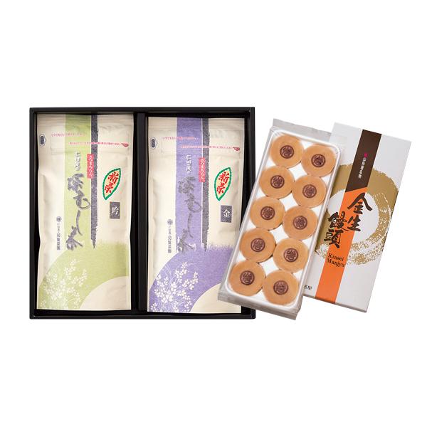 ふるさと銘菓、金生饅頭と深むし茶の詰め合わせです。お茶請けに最適な金生饅頭と新茶のお味をお楽しみください。